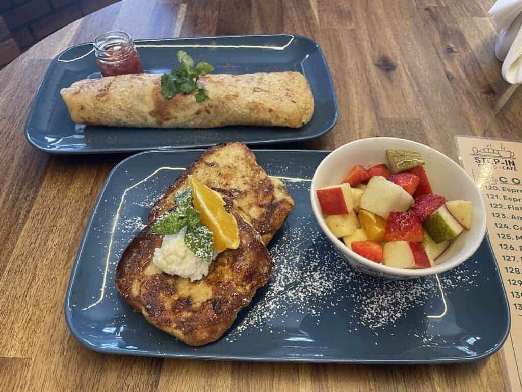 The first on our list is the Step In Bistro. They have multiple types of cuisine. Our order here was the pineapple French toast with Hokkaido bread which you can see in the photograph above. We also ordered an Indian breakfast option which was called Uthappam along with some pancakes.