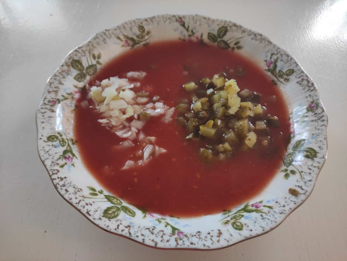 Obviously, to make chłodnik pomidorowy taste more Polish, you need to add dill pickle (ogórek kiszony) to it!